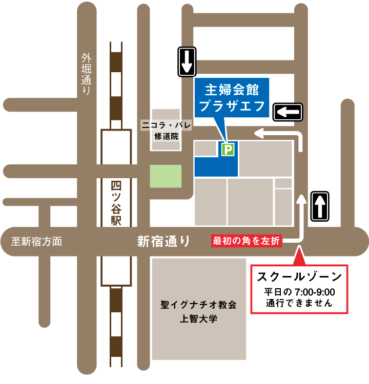 新宿通りを左折する通りは、平日の7時〜9時までは通行出来ません。ご注意ください。